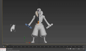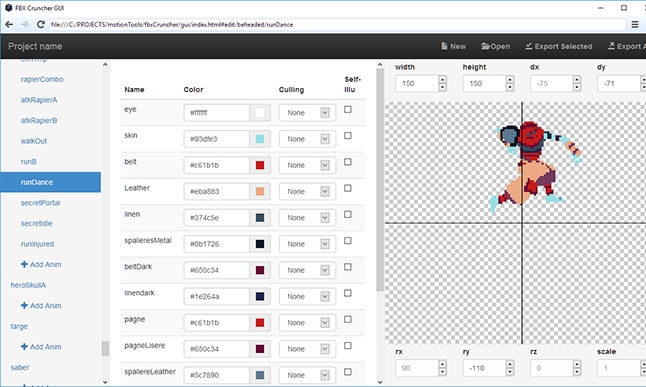 I began by drawing a very basic 2D pixelart model sheet, which I use as a base creating the character and its skeleton in 3D (with 3DS Max), then I export it in filmbox format. The 3D modeling is very basic and would probably make the eyes of any credible 3D artist bleed.