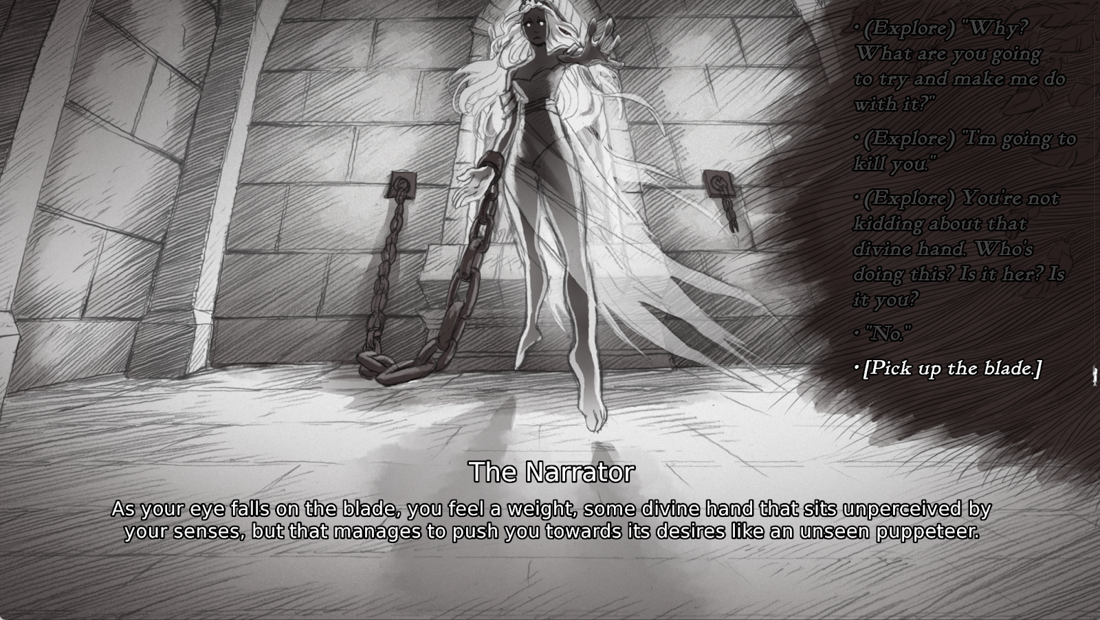 As an example, bringing down the knife in Chapter 1 (expressing skepticism towards the Princess’ intentions) while ultimately freeing her (expressing skepticism towards the Narrator’s intentions) unlocks the Voice of the Skeptic and takes you to the Prisoner chapter. When presented with the blade at the beginning of that chapter, the Skeptic insists that the player takes it, forcing them to act in line with their previous choices, while also reducing the exponential scaling related to that chapter significantly.