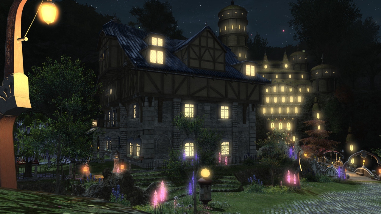 Whereas in UO any open space in the wilderness is a potential house plot, in FFXIV land for housing is strictly limited to specific zones separate from the main game called "housing districts," tied to specific cities that you warp to from the city center. You can think of them as hyper-dimensional suburbs. Each housing district has a different architectural style, and the most popular is Shirogane, which has a distinct Asian theme. It used to be mandatory that all player houses in a district would conform to the local style (can you say "Digital Home Owner's Association?"), but this requirement has since been relaxed. Nevertheless, the differences between districts creates variations in desirability, which is reflected in the black market prices for housing.