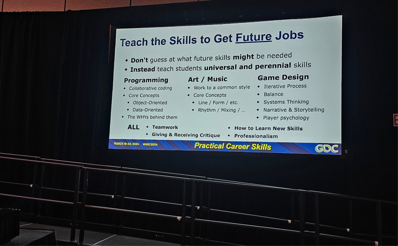 The full talk, of course, goes more into these specifics, and for the nitty gritty details, you should watch the video when it launches on GDC Vault. But one of the most important lessons within is that while the industry is an unstable place now, and will always have more people than jobs, there are reasons to have hope. Work-life balance is improving, the industry itself is growing, and above all, your skillsets are transferrable: programming and IT have applications in nearly every industry; digital art is viable in areas like product design and advertising and marketing; production and development teaches good managerial and people skills; experience design can be applied to the layout of spaces like museums, theme parks and retail. These are only a few examples of how your discipline can be expanded outward. And if you can't apply what you have to a new field, consider how crossover skills aid employment, especially when applying at small companies. The game design program at MSU has a 90 percent post-grad employment rate specifically because they plan for these factors.